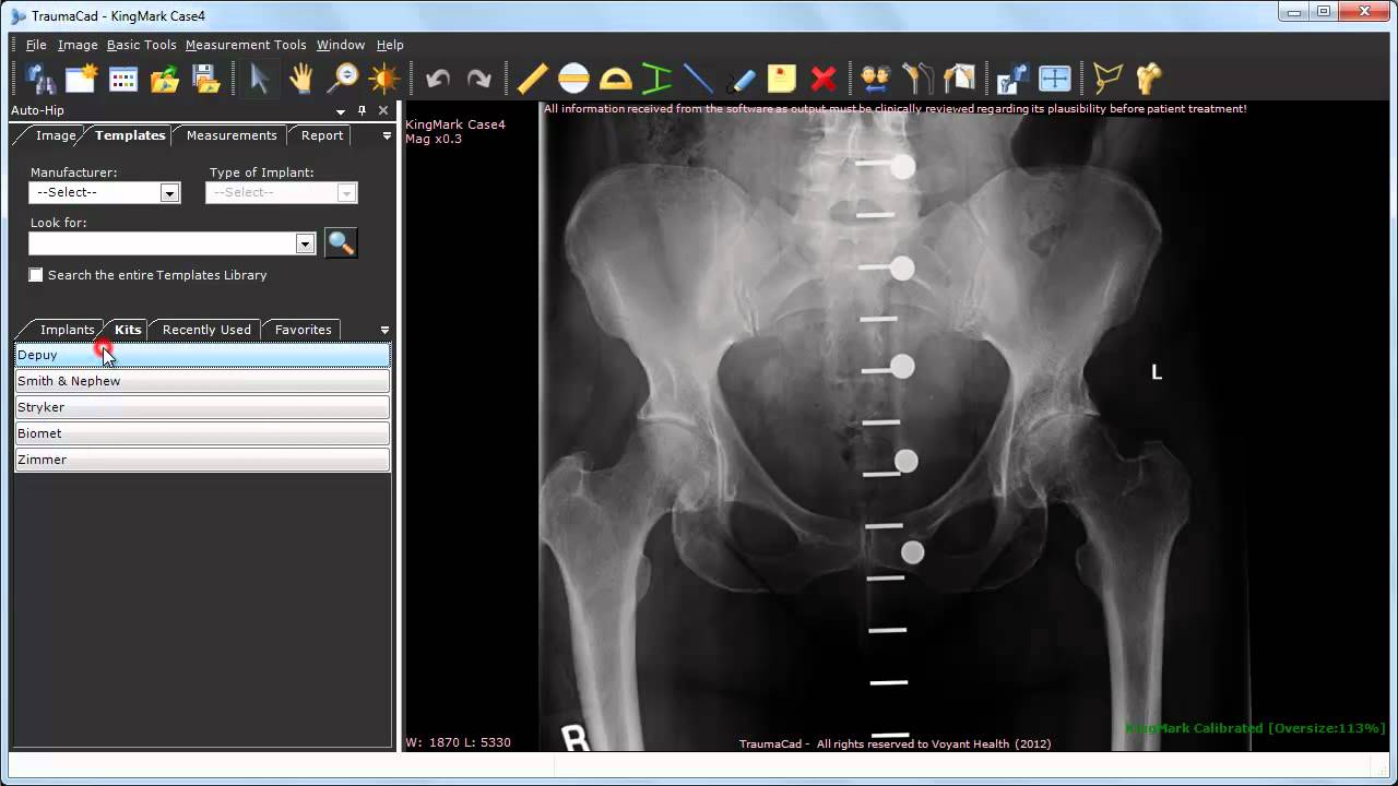 The unique TraumaCad algorithm automatically detects calibration devices such as KingMark, VoyantMark and standard ball markers. The application determines the magnification percentage of the image, thus allowing precise measurement and appropriate template selection.